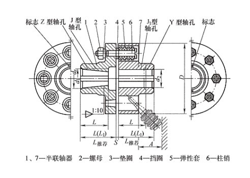 | 型號 | 公稱扭矩 Tn (N.M) | 許用轉速n (r/min) | 軸孔直徑d1 d2 dz | 軸孔長度 | D | A | S | 質量 m Kg | 轉動慣量I (Kg.m2 ) | ||||